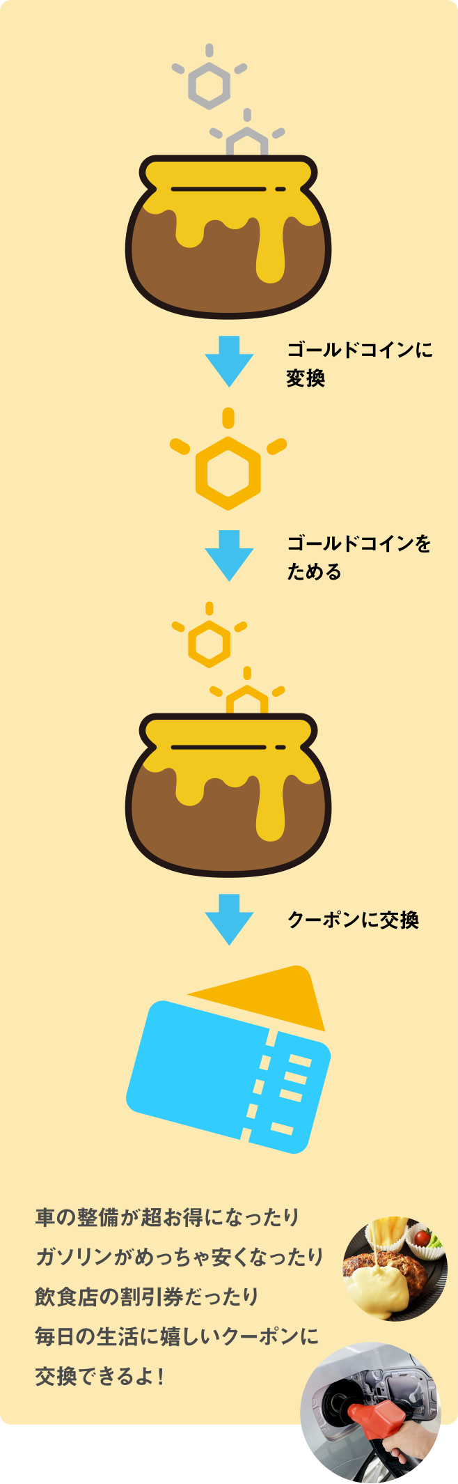 車の整備が超お得になったりガソリンがめっちゃ安くなったり飲食店の割引券だったり毎日の生活に嬉しいクーポンに交換できるよ!